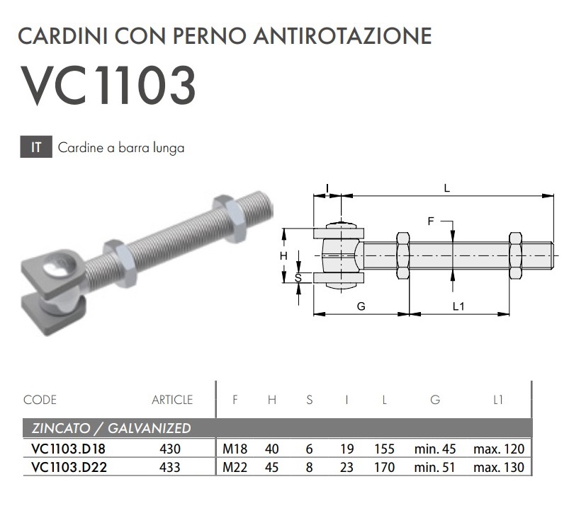 Cardine cancello a barra lunga in acciaio zincato FAC VC1103 - | M18