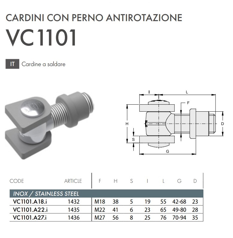 Cardine in acciaio inox con boccola e perno antirotazione FAC VC1101 - | M18