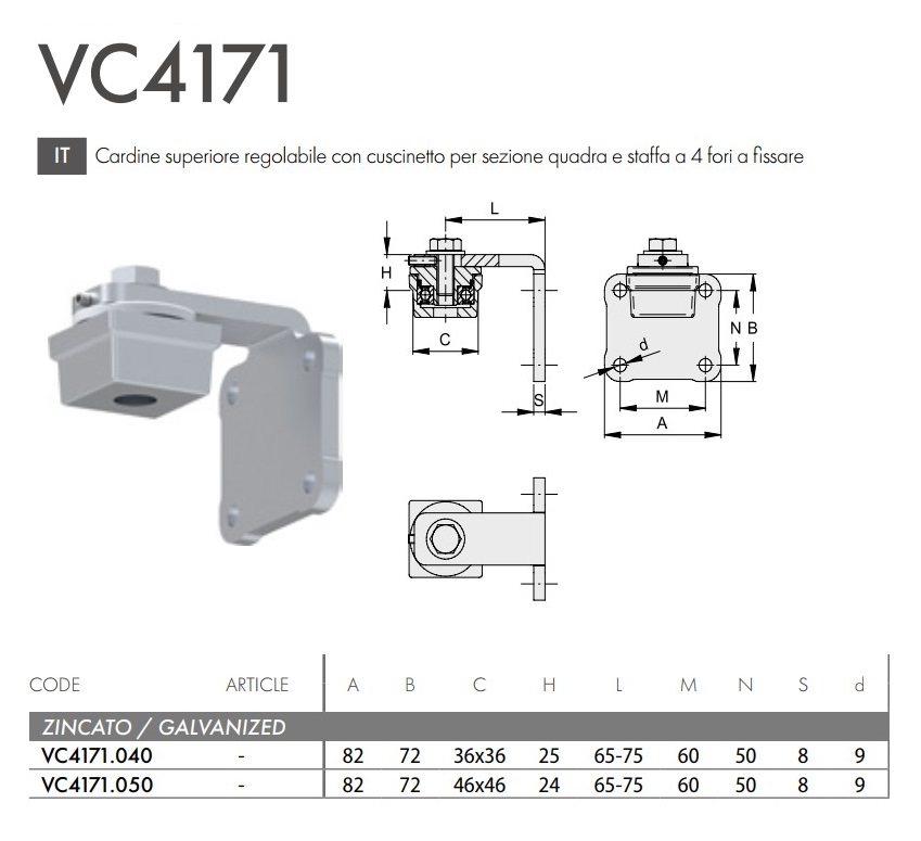 - Cardine superiore zincato regolabile per cancello con piastra FAC VC4171 - quadro mm 36x36