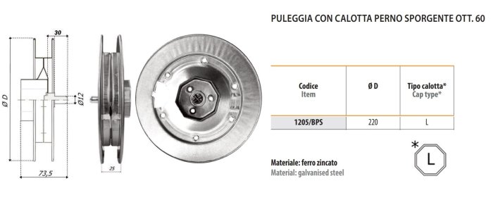 - Puleggia per tapparella ø 220 mm perno sporgente ottagonale 60 Bolis 1205/BPS