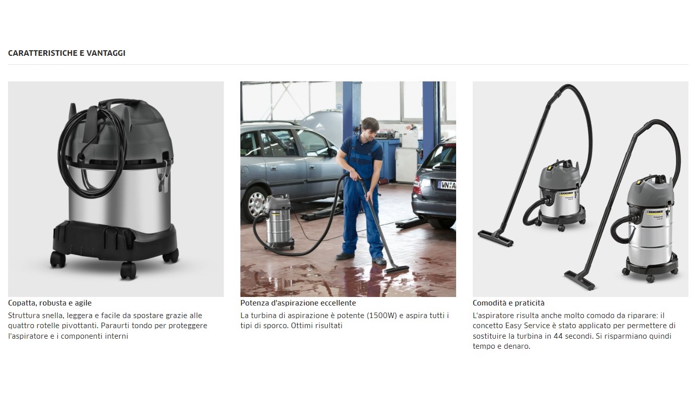 Pensato per quantità moderate di sporco liquido, solido e polveroso: questo modello è ideale per aspirare tutti i tipi di sporco grazie alla turbina da1500 W e al vano raccolta da 30l. Su questo modello è operativo l'Easy Service Concept, che garantisce costi di funzionamento e di manutenzione molto bassi grazie alla tecnologia filtro affidabile.