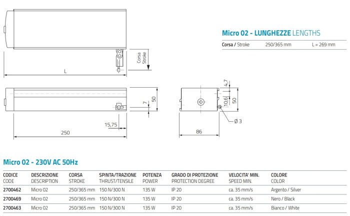 Attuatore elettrico lineare a catena 230V Mingardi MICRO 02 corsa mm 250/365 - - argento