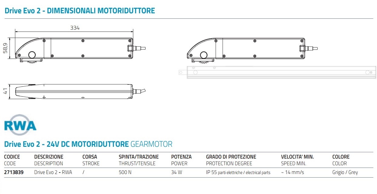 - Attuatore elettrico lineare a cremagliera Mingardi Drive Evo 2 RWA 24Vdc grigio