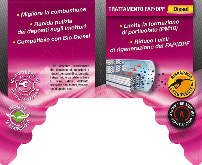 L'additivo Diesel Trattamento FAP/DPF riduce la produzione di PM10, migliora la combustione e fa in modo che il filtro antiparticolato si sporchi meno. Estende gli intervalli di manutenzione del filtro antiparticolato FAP e DPF riducendo i cicli di rigenerazione. Estrema pulizia con un unico trattamento con un solo pieno di carburante. Restituisce la potenza originaria del motore. Contribuisce alla riduzione del consumo di carburante. Compatibile con biodiesel attualmente in distribuzione il prodotto è testato secondo test XUD9 e CEC DW 10.
