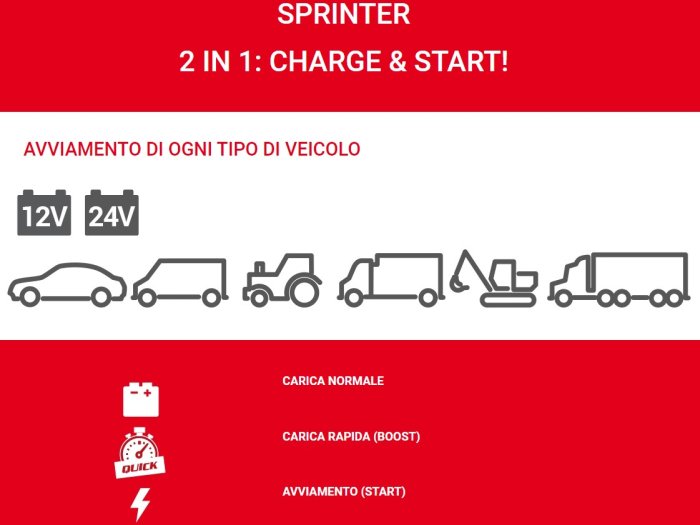 - Carica batterie e avviatore per la carica di batterie ad elettrolita libero (WET) con tensione di 12/24V e l'avviamento rapido di tutti i tipi di autovetture, furgoni, autocarri leggeri.
