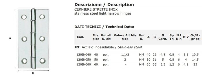 - Cerniere 2 ali strette forate acciaio inox ALDEGHI 120IN - mm 40