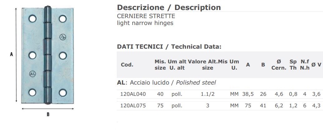 - Cerniere 2 ali strette forate acciaio lucido ALDEGHI 120AL - mm 38x26