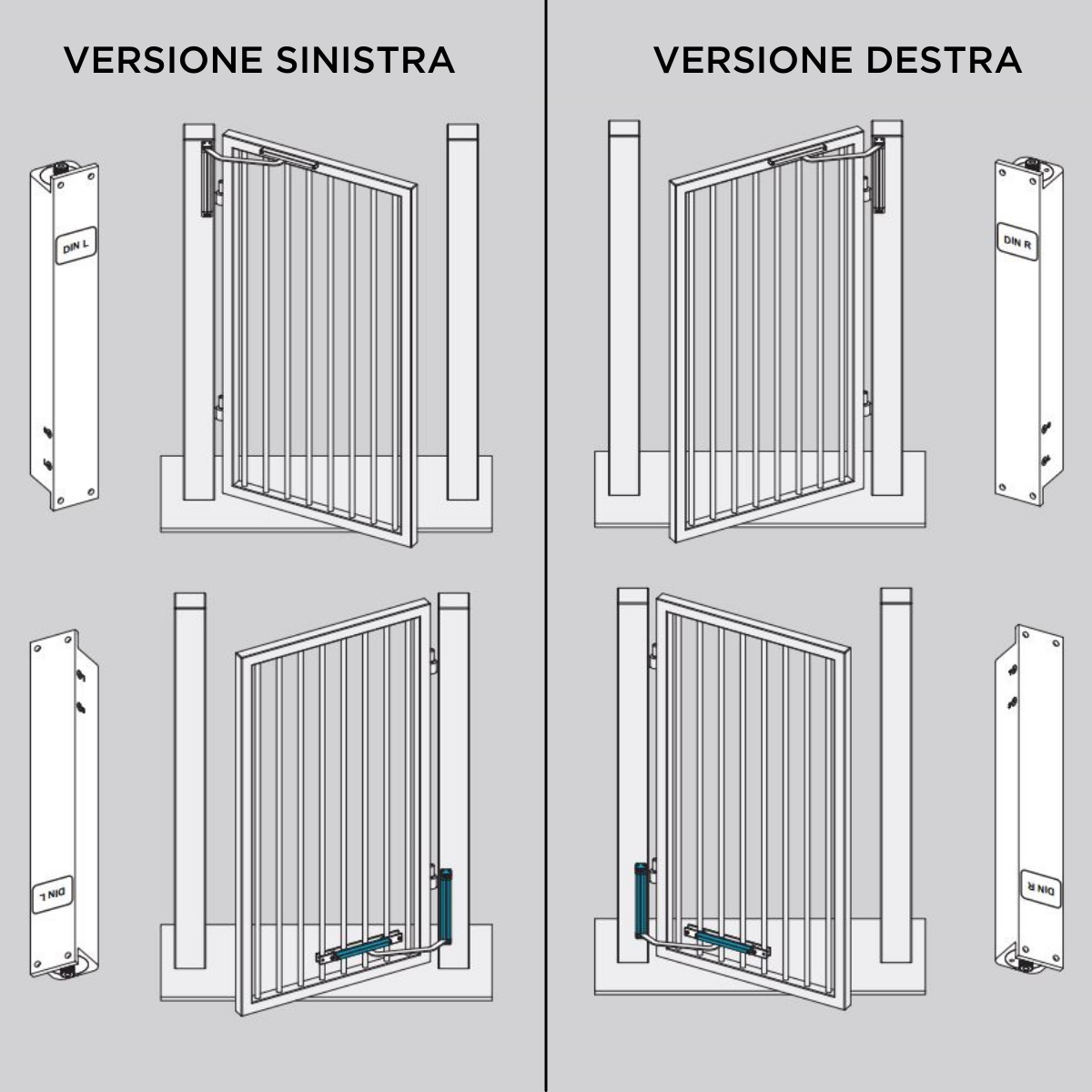 - Se il chiudicancello va installato in alto per cancello con cerniere a dx si dovrà scegliere la versione dx