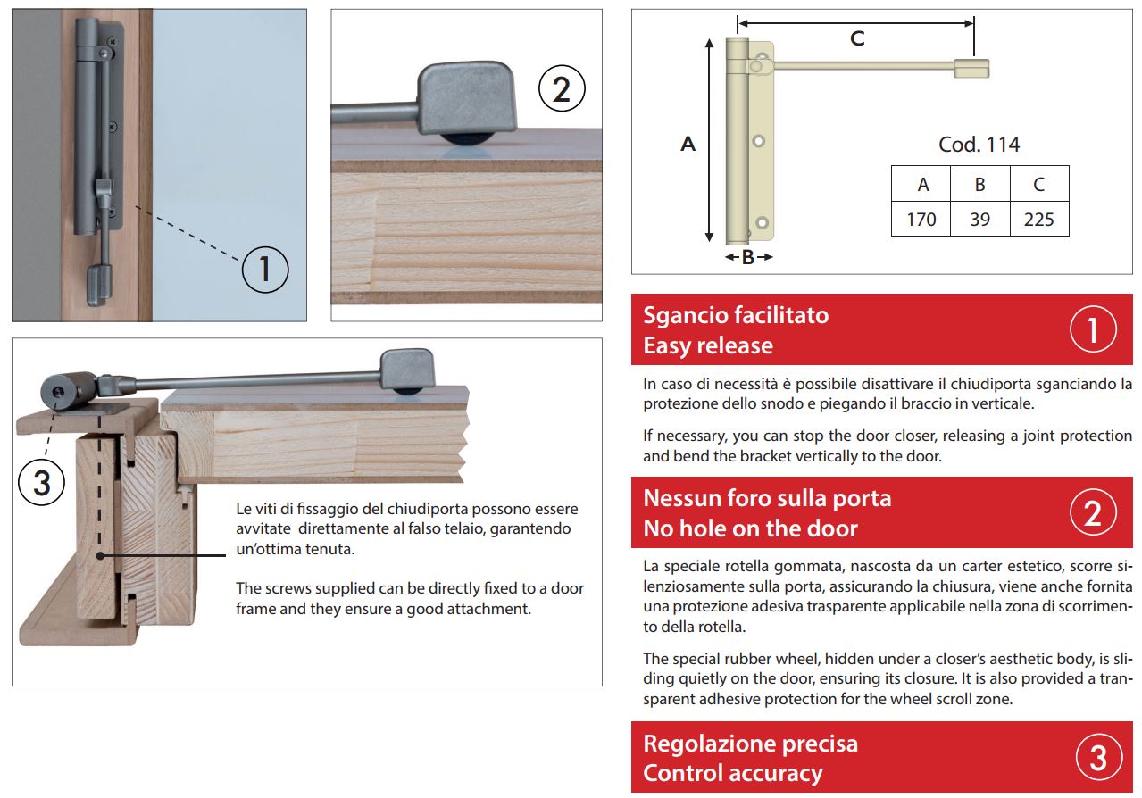 - Il braccio di spinta del chiudiporta è munito di una ruota gommata, nascosta da un carter estetico, studiata e progettata per scorrere silenziosamente sulla porta.