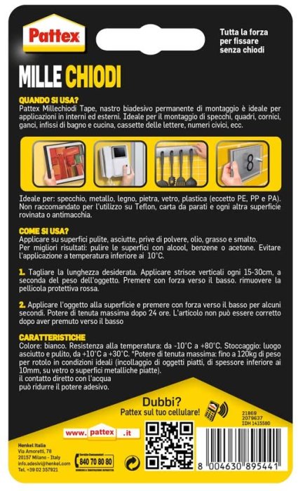 - Con il nastro biadesivo per muro Pattex Millechiodi Tape si potrà dire addio a buchi e fori nel muro!