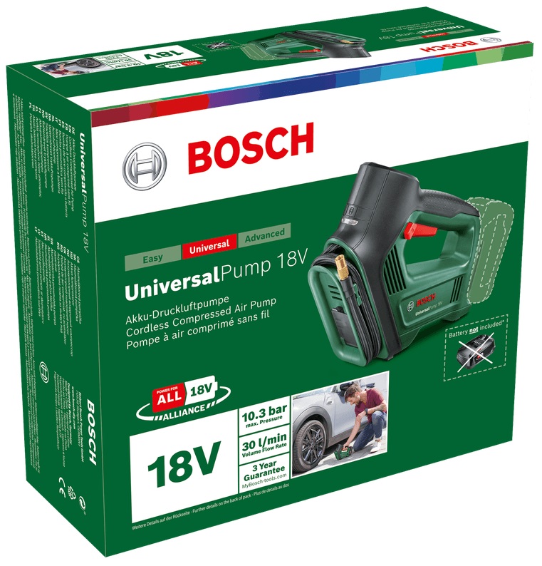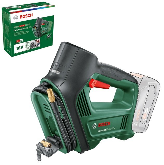 - Un gioco da ragazzi: UniversalPump 18V è ciò che ti occorre per gonfiaggi rapidi – con portata fino a 30 litri al minuto – per un impiego pratico ed intuitivo.