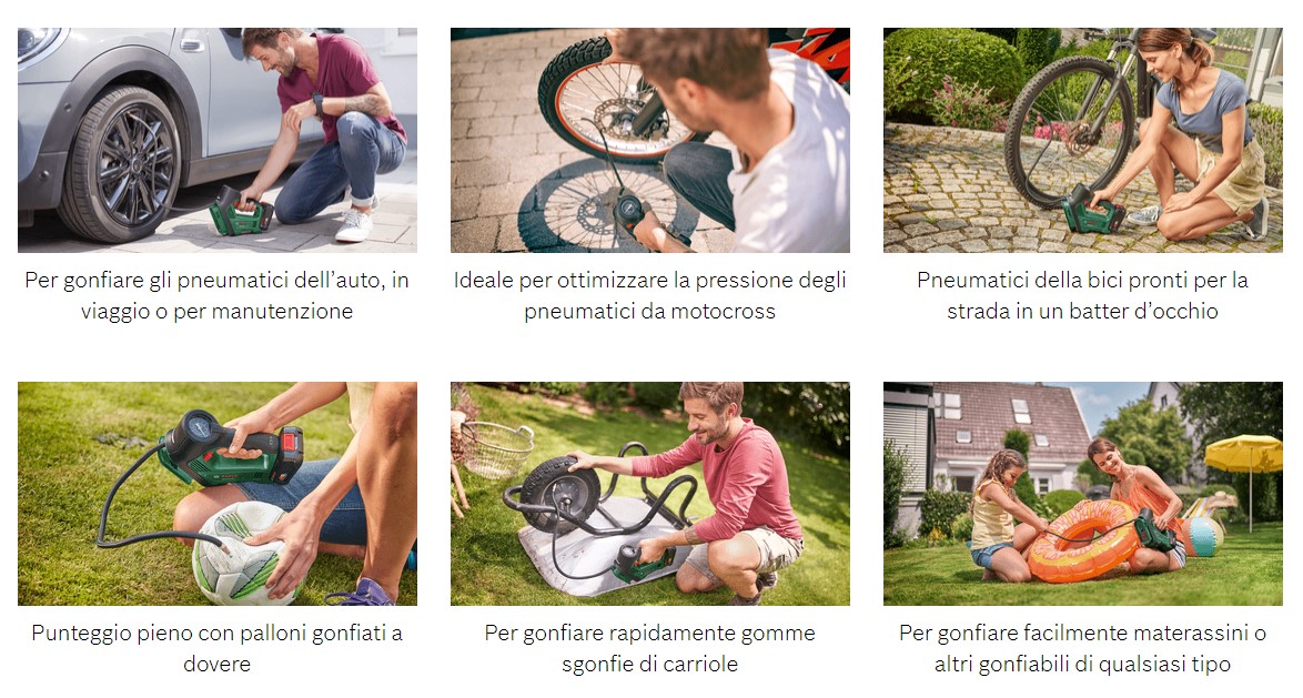 - Gonfia oggetti di grandi dimensioni che richiedono pressioni elevate, ad esempio pneumatici e palloni