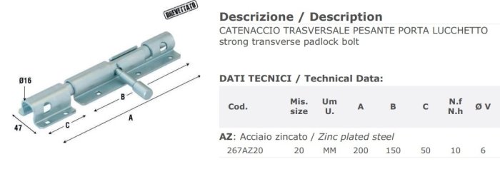 Catenaccio trasversale in acciaio zincato Aldeghi 267AZ mm 200x47