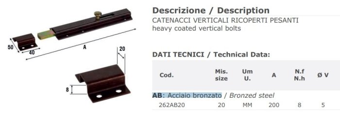- Catenaccio verticale acciaio bronzato Aldeghi 262AB mm 200x50