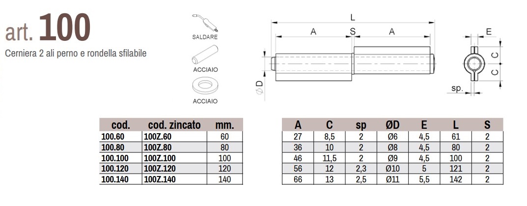 Cerniere 2 ali in acciaio con perno sfilabile COMBI 100