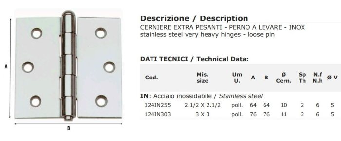 - Cerniere pesanti 2 ali acciaio inox Aldeghi 124IN - mm 64x64