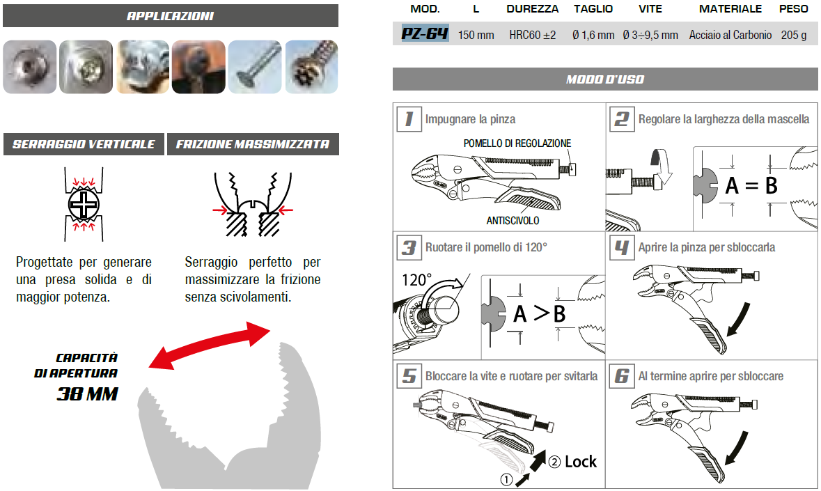 - Sistema di bloccaggio automatico per girare la vite senza dover tenere serrata la pinza