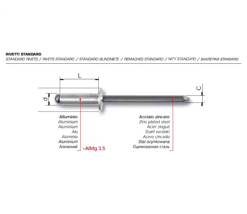 - Le dimensioni (d x L) sono riferite al ø x lunghezza della testa del rivetto
