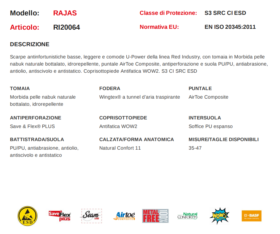 Scarpe antinfortunistiche basse, leggere e comode U-Power della linea Red Industry, con tomaia in Morbida pelle nabuk naturale bottalato, idrorepellente, puntale AirToe Composite, antiperforazione e suola PU/PU, antiabrasione, antiolio, antiscivolo e antistatico. Coprisottopiede Antifatica WOW2. S3 CI SRC ESD. Requisiti di resistenza allo scivolamento secondo la en iso 20345:2011 con metodo secondo la en 13287:2012