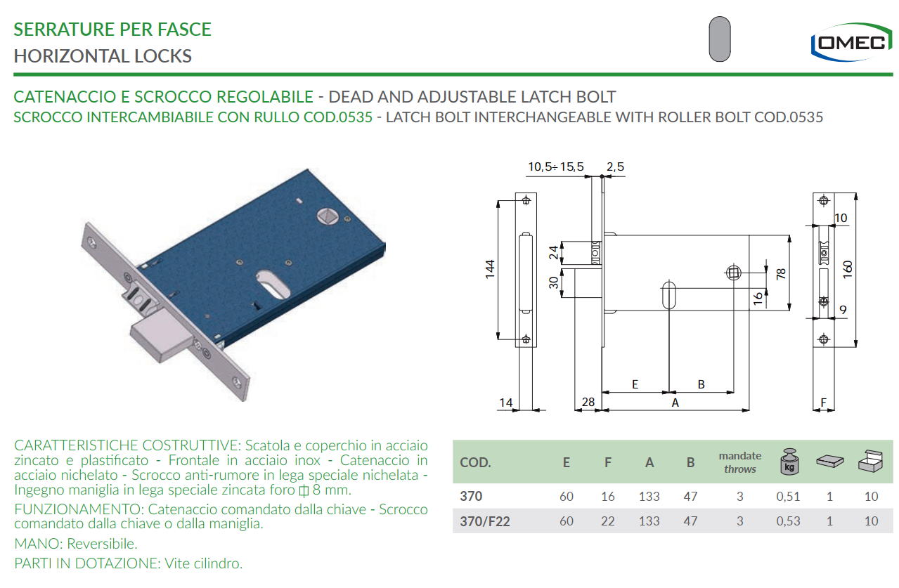 - Serratura per fasce catenaccio e scrocco regolabile Omec 370 - frontale 16 mm