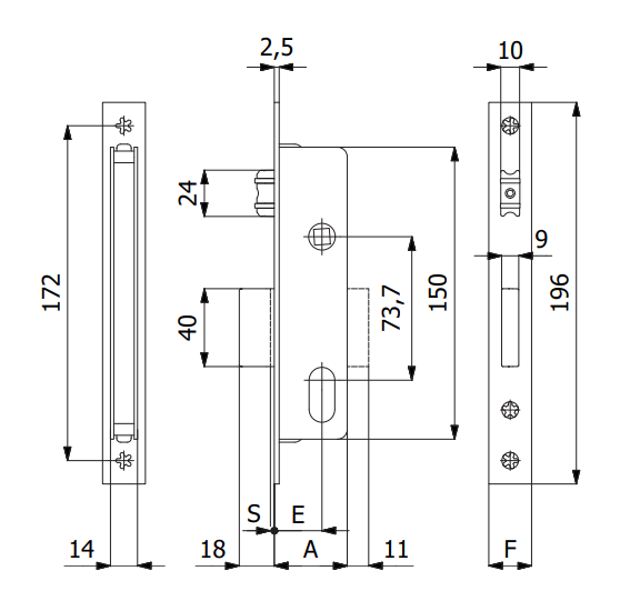 Serratura per montanti con catenaccio e rullo Omec 348 - frontale 16 mm