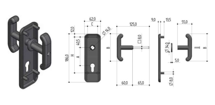 - Interasse (A) foro cilindro/quadro maniglia 60 mm