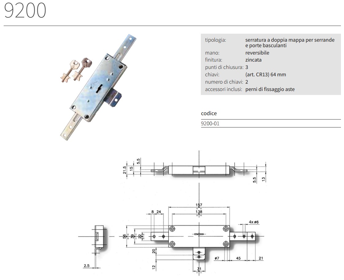 - tipologia: serratura a doppia mappa per serrande e porte basculanti