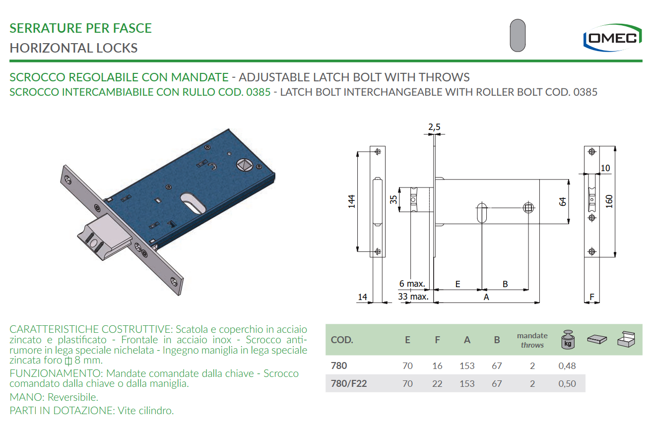 - Serratura da fasce scrocco regolabile e mandate Omec 780 - frontale 16 mm