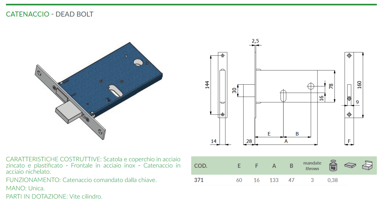 Serratura per fasce solo catenaccio Omec 371 frontale 16 mm