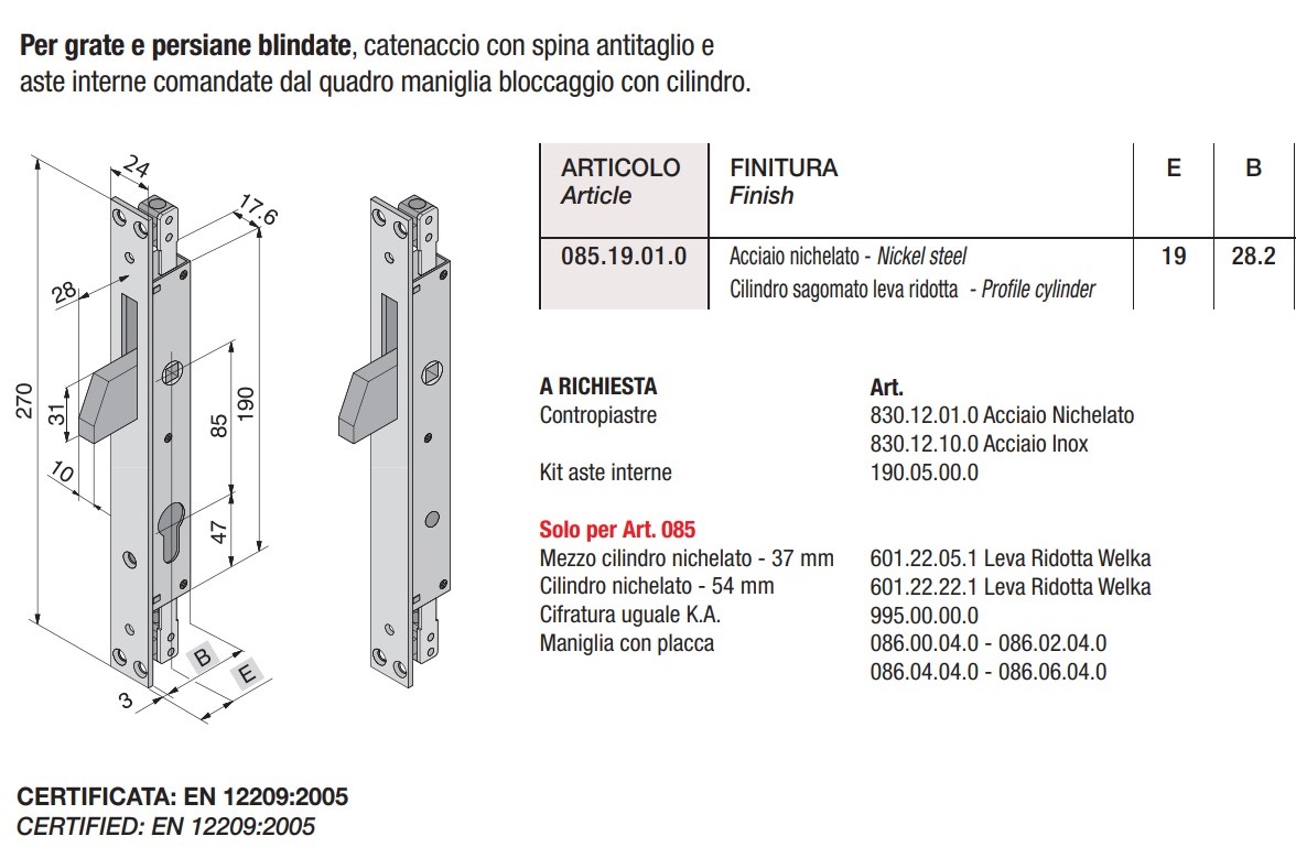 Serratura Welka 085.19 per persiane blindate aste interne - Entrata 19 mm