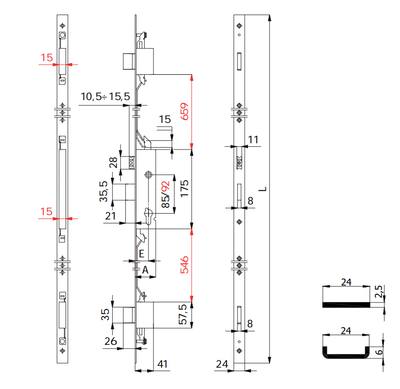 - Serrature multipunto ad ingranaggi Omec 1700S.UL frontale U - E mm 25