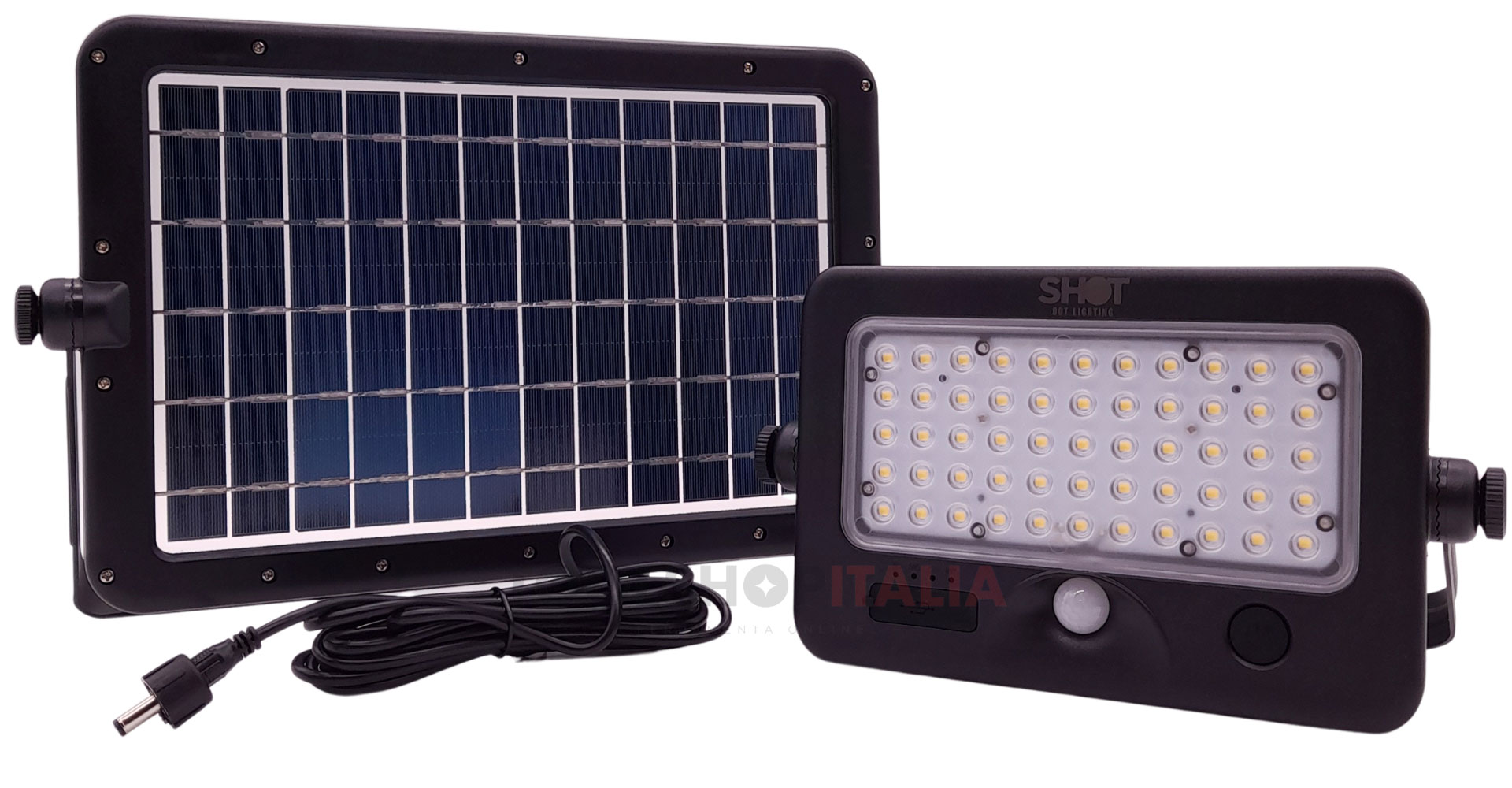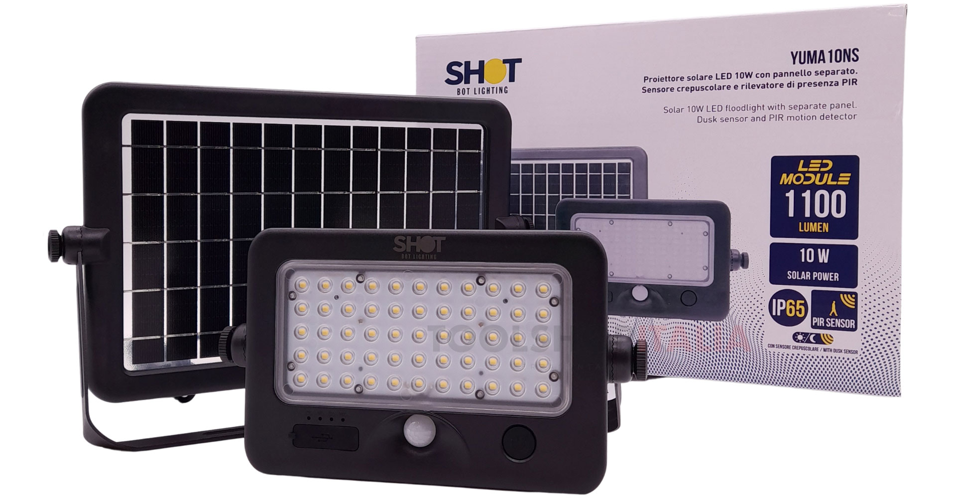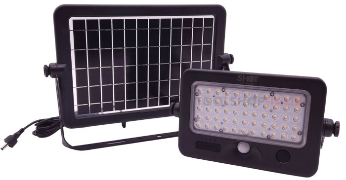 - Rilevatore di presenza a microonde e pannello solare separato, che consuma 10W e produce 1100 lumen a luce neutra 4000K con un fascio di 90° gradi.