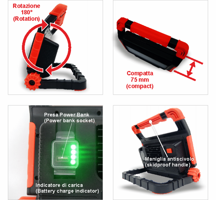 - Equipaggiato con matrice di LED SMD da 50 Watt che garantisce un'alta affidabilità ed una batteria ricaricabile agli ioni di Lithio ne fanno un prodotto portatile, leggero e robusto.