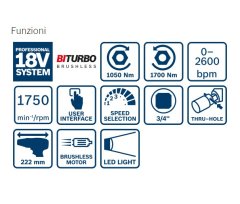 - Prestazioni ai massimi livelli: avvitatore a massa battente «High-Torque» da 3/4" con tecnologia BITURBO Brushless