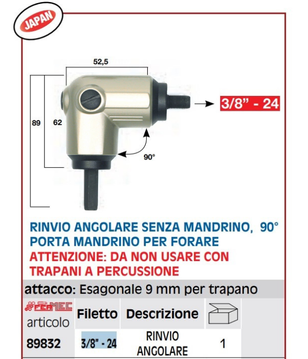 Rinvio angolare 90° senza mandrino attacco esagonale (9 mm) FERMEC 89832