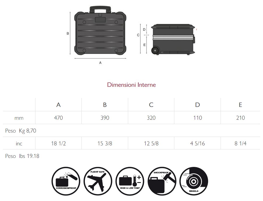 - Contenitore di grande capienza, con angoli rinforzati, ideale per il trasporto aereo. Indicata per utenti professionali con l’esigenza di trasportare utensili manuali, pezzi di ricambio o elettroutensili.