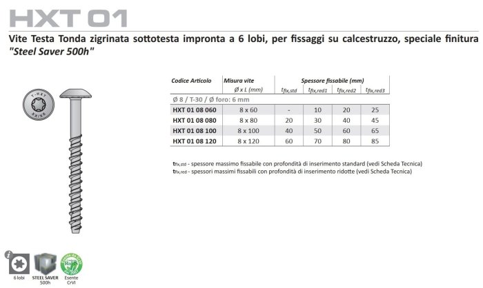 Viti TECFI HXT01 fissaggio calcestruzzo testa tonda Torx steel saver 500h - ø mm 8x60