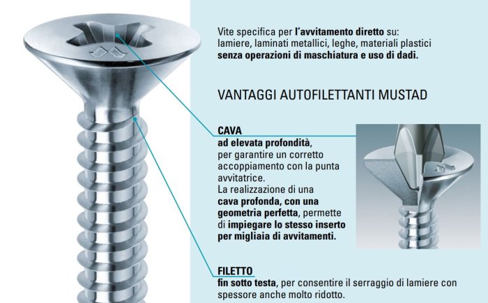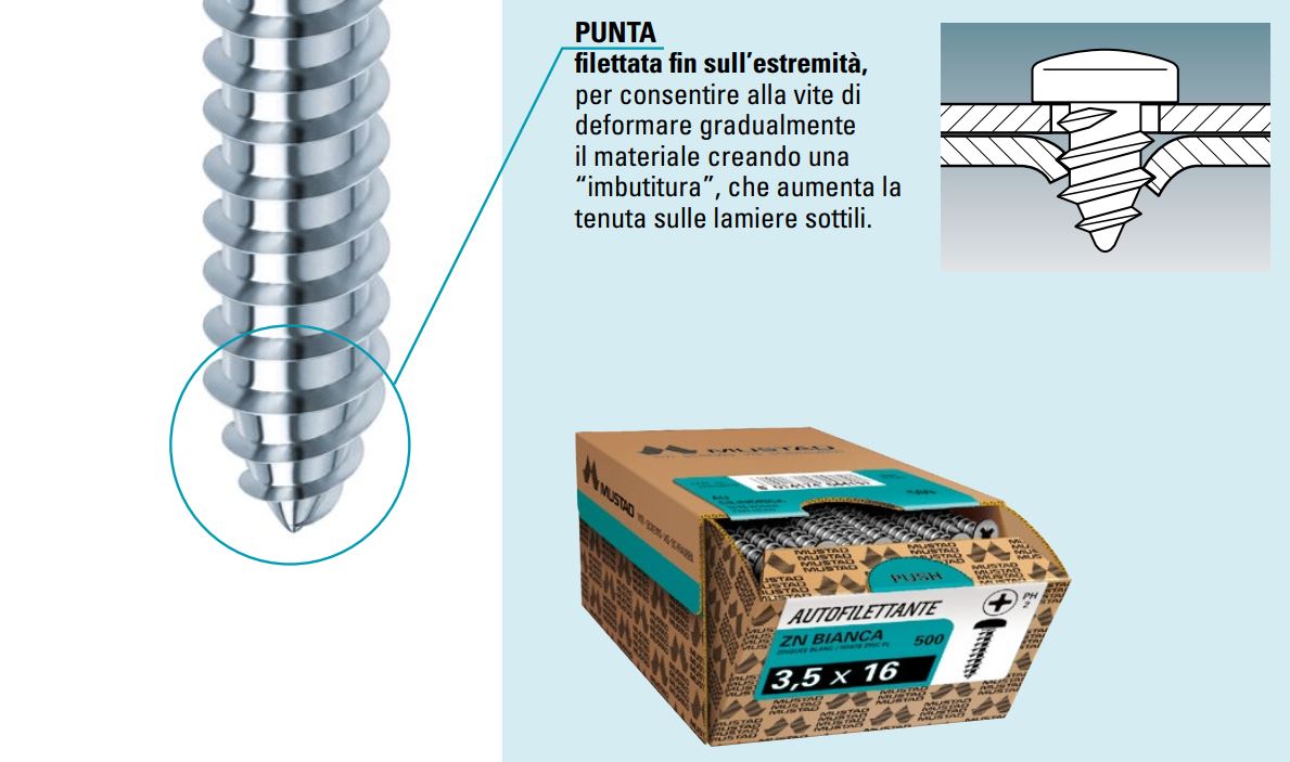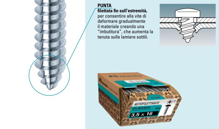 - filettata fin sull’estremità, per consentire alla vite di deformare gradualmente il materiale creando una “imbutitura”, che aumenta la tenuta sulle lamiere sottili.